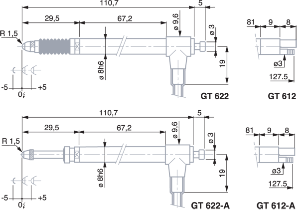 * Номинальное значение при электрическом нуле; макс. отклонение ±25%. Действительно при вертикальном положении щупа и измерительном стержне, направленном вниз, а также для статического измерения.